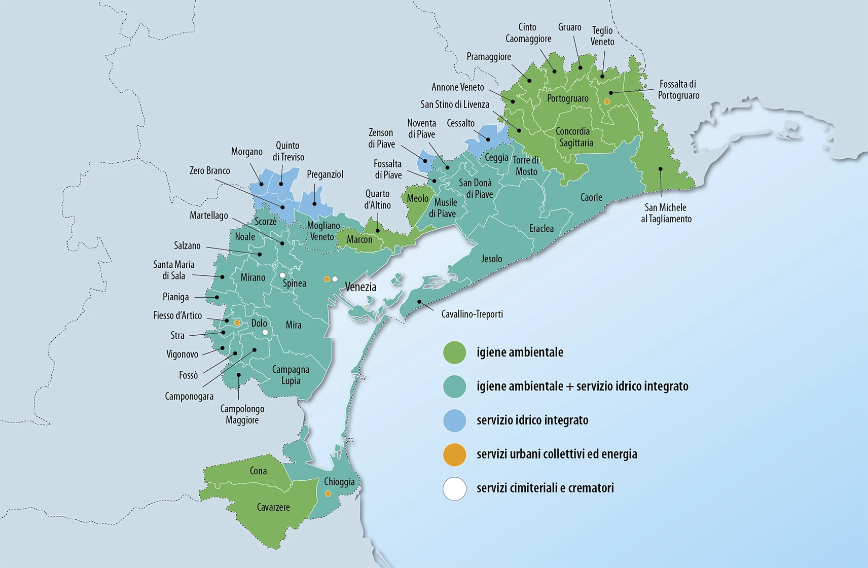 - servizi urbani collettivi:in 6 Comuni (gestione di cimiteri, mercato ittico all’ingrosso di Venezia, bonifiche ambientali, fase post mortem delle discariche, manutenzione urbana, posa delle passerelle in caso di alta marea e allestimenti percorsi in caso di neve, servizio calore e illuminazione pubblica, servizi igienici)